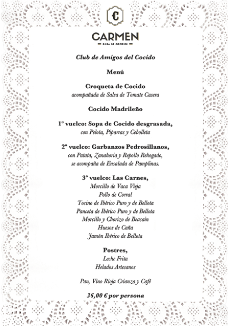 Mucho se empieza a hablar en la Villa y Corte sobre lo excepcional del preparado que se elabora en Carmen-Casa de Cocidos, sito en la calle Ibiza número 40. Y sabes que nosotros jamás aceptamos afirmaciones tan taxativas sin antes comprobar con nuestro propio gaznate y nuestra lígrima andorga su veracidad. Es así como hemos llegado a concertar con los dueños de ese establecimiento una sesión práctica de ingesta gastronómica el miércoles, día 24 del presente mes de enero a las 14,30 horas. En el curso de ella, enjuiciaremos el cocido que, con carácter especial para nosotros, elaborará Carmen Carro, su jefa de cocina, en los términos que figuran en el Menú que acompaño a la presente.