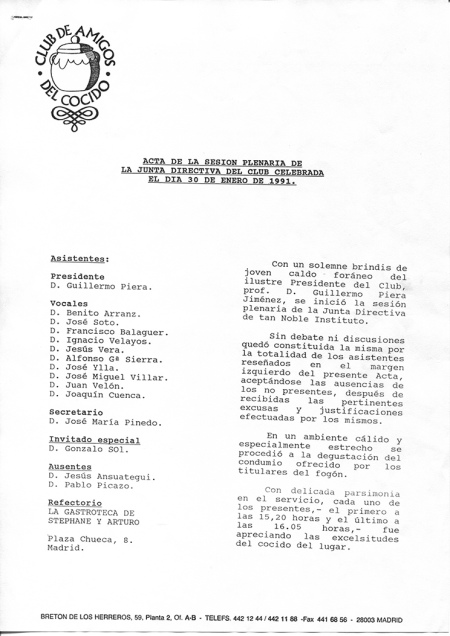Es para mí un motivo de satisfacción comunicarte la reanudación de las actividades de investigación culinaria y gastronómica que llevaron a la fundación de este Club, hoy tan prestigioso en todo el mundo.Gracias al celo infatigable de nuestro Secretario General, Profesor D.José María Pinedo, tendremos la oportunidad de celebrar una reunión de trabajo el próximo miércoles, día 30 de Enero,a las 14,45 horas en el establecimiento conocido como "La Gastroteca de Stephane y Arturo", sito en la Plaza de Chueca Nº 5.