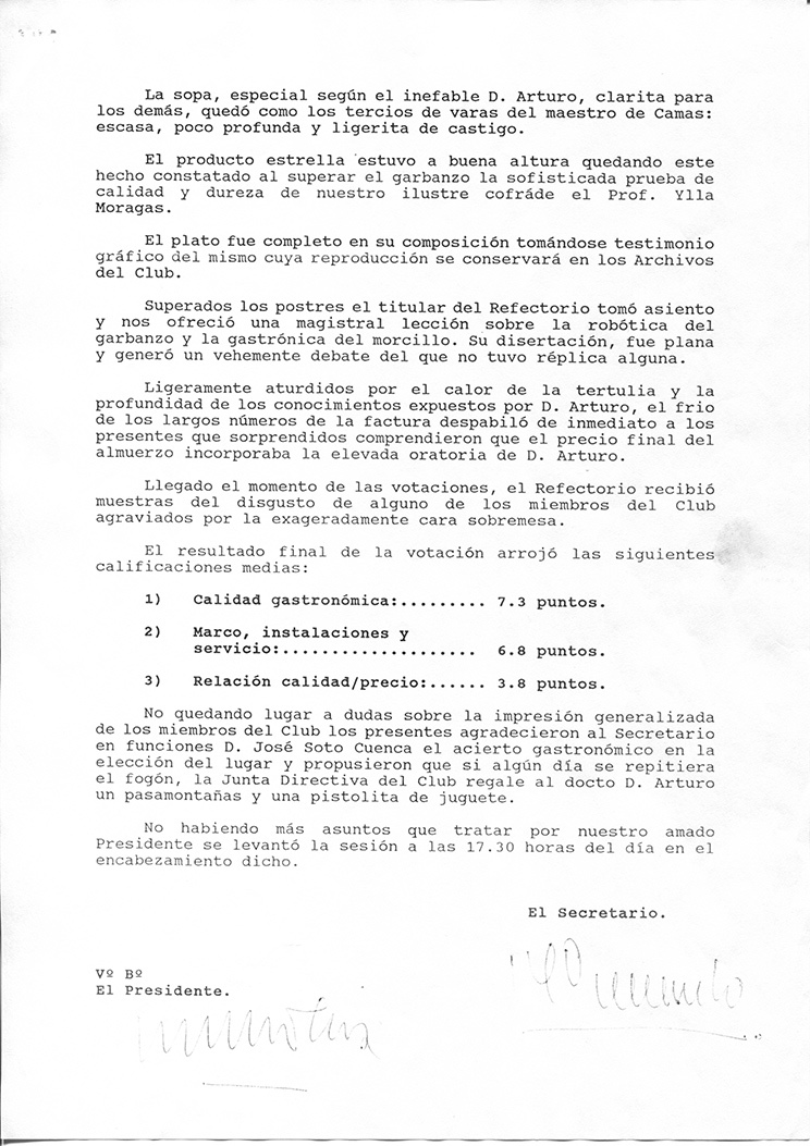 Será, como de costumbre, un placer para todos nosotros el que, dejando a un lado tus muchas ocupaciones, nos ayudes con tu probada sapiencia a formar un recto juicio sobre la calidad del Cocido a degustar, la propiedad del marco en que lo hagamos, y la aceptabilidad de la relación calidad/precio fijada por los restauradores.